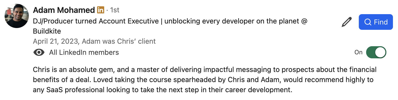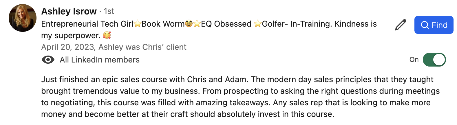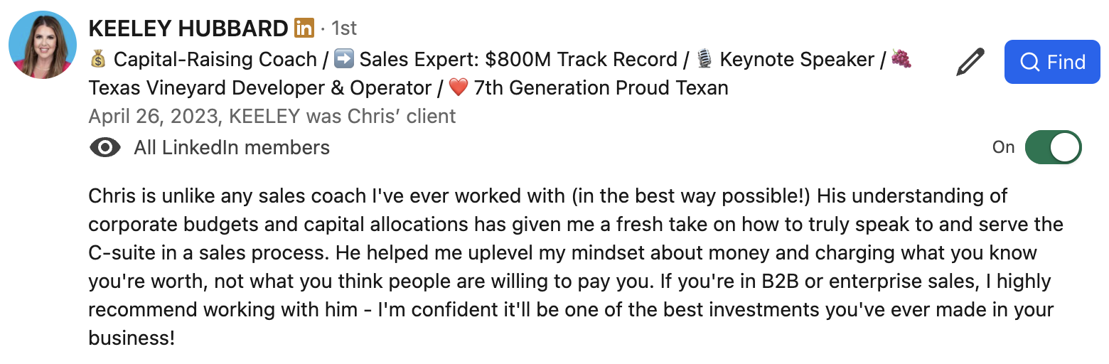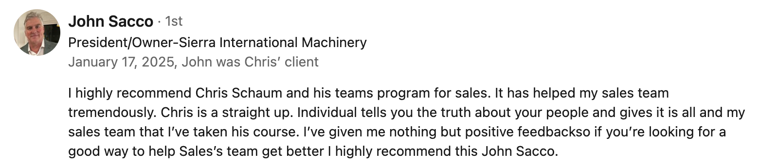 I used to hate sales. I went through every training system you can think of. I realized they were all trying to be complex for the sake of "being proprietary." I sorted out how to make B2B simple. Once it became simple, it became fun. Finance is the language of executives, but most sales professionals, even CROs, don’t get it. I’ll make it easy for you. I’ll teach you how to sell any product or service as an investment any CEO can get behind. I’ve been a part of over $200 million in closed deals.